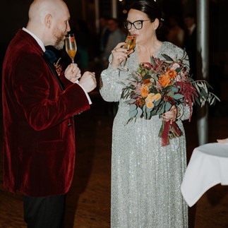 I love Autumnal colours and the deep plums, peach, coral, pinks and oranges that are around this time of year, and we tied these colours into everything from the table centres and the ribbons on the reserved seat signs, to the tambourines (more on that later). We opted for pocket squares for the key bridal party, corsages for the Mums and Bridesmaid, and the most incredible bouquet for me. It was absolutely stunning and was put together by the insanely talented Milly Davey Flowers in Crawshawbooth. Milly’s distinctive wild style was absolutely spot on and the flowers were an absolute show stopper. I was also incredibly proud to have grown a few dahlias myself which we used around the welcome sign which looked really beautiful alongside the disco ball styling. I’ve loved disco balls for forever, and I know they are on trend at the moment, but that's not why I chose them. As my friends can testify the disco balls have been dotted around our house for years, it’s definitely not just a fad for us.