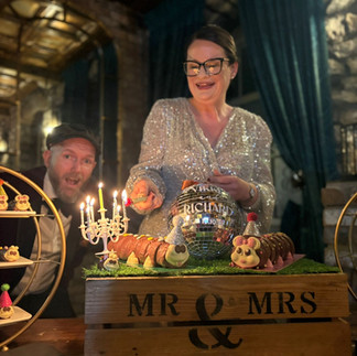 Colin & Connie Caterpillar Cake - a household birthday favourite we had these instead of a wedding cake, and so we didn't have to decapitate them with a knife we instead blew candles out on them. We instead cut a ceremonial pork pie to signal the evening buffet being ready.